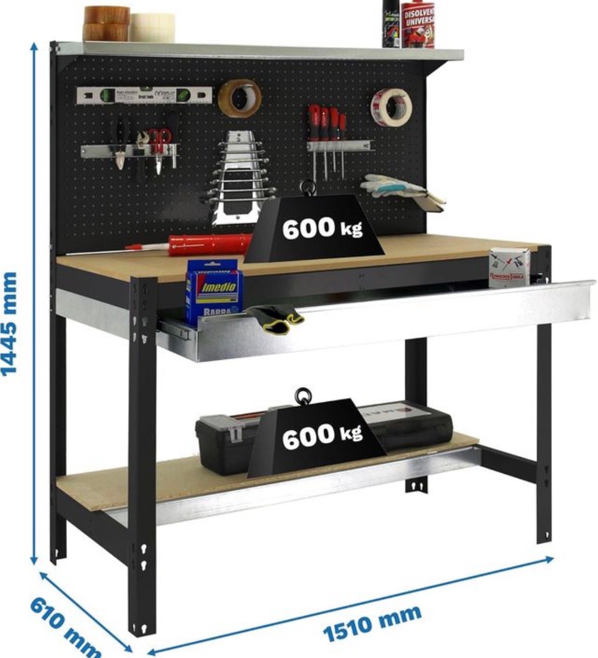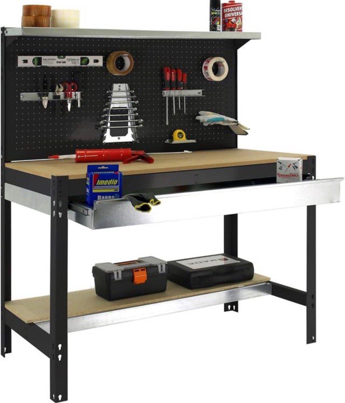 Banco de trabajo para taller de la marca Simon Rack. Estructura robusta y diseño funcional.